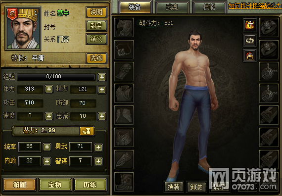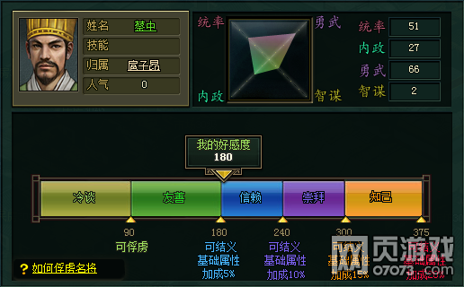 这是一个一星的名将(不要吐槽为什么用这个将,只是顺手,而且一天结交就能看出效果),这是他一级,不穿装备的截图,然后我们结交他,并且把好感养到信赖,就跟下面这张图一样