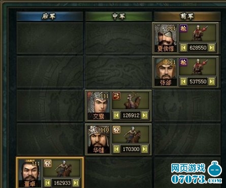 然后是中军,中军我同样选用本版本BUG兵种弓骑兵,最为远程兵种最重要的是什么,很多对盟战有一定见解的大神都知道一定是先手的速度,而远处兵速度最快的就是弓骑兵了,在配合长蛇阵的速度加成。啧啧,想打架?我先揍你个七荤八素的。其中中军的中间也就是上图中文鸯所在的位置需要放置一名防高血后的武将的,因为如果对手使用的是鹤翼阵,雁行阵,和锋矢阵的时候,这个位置的弓骑兵是处在一个挨打的局面所以需要带有一点MT型的将领(如果觉得不放心可以把刀盾兵换上,但是本帖不建议,打仗没有不冒险的,既然要求高回报,那就必须要承担一定的风险)