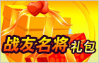 战友名将礼包累计获得2000积分即可领取。封测服务器不能使用,仅限正式运营后的“热血一区”“热血二区”“热血三区”使用,内含价值2000元宝的游戏内道具,另附送20级紫色装备一套,请在2012年3月1日之前使用,逾期失效。兑奖奖品