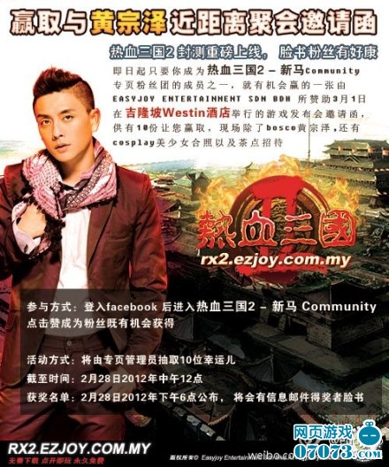 热血三国2在成功打下国内市场之后,下一步将是突破国门,进军海外。据2月16日报道,已经获得热血三国2新马泰代理运营权的Easyjoy CEO eddy将邀请乐港CEO陈博、香港TVB当红艺人黄宗泽,参加3月1日在吉隆坡举行的产品发布会。