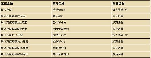 活动期间充值,玩家充值一定数额的元宝,即可获得系统赠送的奖励。