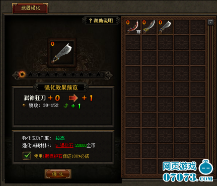 进入武器强化系统界面玩家可以清晰地看到通过强化,自己的武器可以提升的属性效果,《热血屠龙》中强化需要消耗材料黑铁矿石和一定数量的金币。与许多同类型游戏相同,武器的强化有成功率的制约,强化等级越高,想要再次获得提升也更困难,如果想要保证自己的武器100%强化成功,玩家可以使用道具天外陨铁。