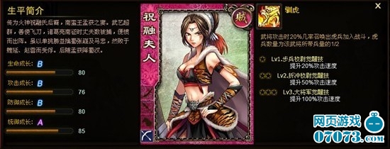 南蛮王孟获之妻,使长标,背插五口飞刀,百发百中。三江城为蜀相诸葛亮所得,夫人替夫出 祝融夫人阵,以飞刀伤张嶷之手,又擒马忠,生擒二将。后为赵云、魏延挑衅,深入敌,旋即为马岱以绊马索擒下。以女子之身,正面蜀国大军,可见其气概。在《热血无双》之中祝融出来可以召唤虎兵之外,封赏过后还能极大的提升其攻击速度。攻击急速的提升不仅能够其技能发动的概率,也能让其物理攻击效果得到极大提升。