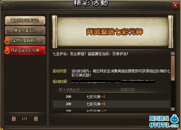 活动内容:活动时间内,每日拜武圣消费指定额度即可获得相应阶梯的七彩元神奖励!