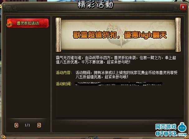 活动内容:活动期间,拥有冰狼或以上骑宠的玩家花费金币修炼兽灵将享受八五折超值优惠,赶紧来参与哦!
