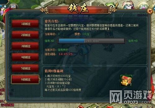 在游戏中,如果觉得元宝不够用了,可以向钱庄去贷款元宝,贷款元宝的信誉等级分为6级,1级依次可贷款100元宝,2级可贷款200,以此类推,每次贷款的还款期限为20个小时,只能用游戏中的银票还款,银票可以在钱庄任务中获得,每次一张,每天可以接10次钱庄任务。1级还款之后可获得100信誉度,2级200,以此类推。