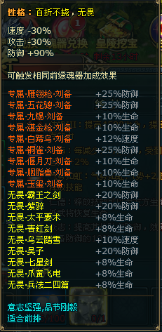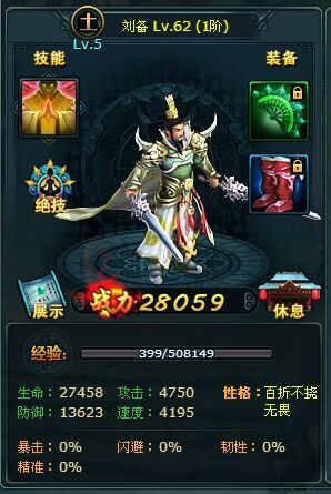 刘备性格是百折不挠,无畏,属性是速度和攻击减少30%,防御增加90%!看到没!90%!变态不?这就是典型的前排肉盾,但是刘备的技能回复自身1点气势,感觉有点鸡肋,因为平A对方会涨2点气势,4点气势放技能,举个例子,3阶刘备起手4气势,放完技能消耗掉4气势,回复1气势,然后再平A,变成3气势,之后需要再次平A才能达到4气势,这样来说,技能回复的那一点气势没啥实际作用。。。。。所以在进行坦克英雄选择的时候,刘备并不是首选,但是鉴于他90%的防御增加属性,也有很多人喜欢用刘备,总体来说还是一个不错的肉盾型英雄。