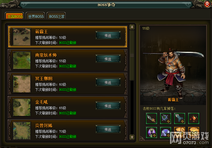 个人BOSS总共有6个,分别是50级的山大王,60级的蒋霸王,70级的妖术师,1转的金毛吼,2转的董卓遗将,3转的百里长青。每个BOSS每天都有两次挑战机会,击败他们之后就可以收尸行当,拾取他们掉落的各种物品。