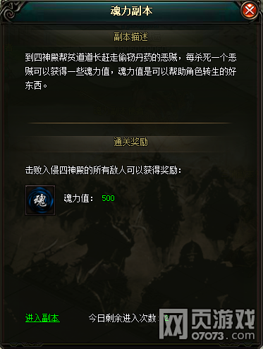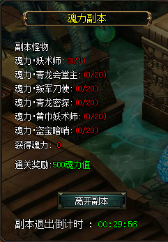 在王城处领取魂力副本任务后,将会被传送进副本地图四神殿内,按照要求击杀相应数量的怪物并且达到要求后。会获得相应的魂力及通关奖励。副本完成后点击离开传送回王城即可。