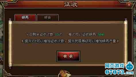 同过官府的征收菜单可以收取银两和粮食,收取的数量与名居等级和农田等级有关,民居和农田等级越高,增收的资源越多。