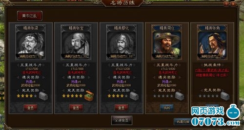 b、名将历练武将挑战条件:通关该名将前的所有名将,并满足该名将的挑战条件。
