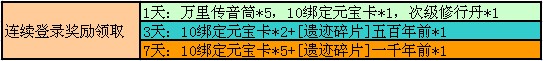 2、所有玩家连续登录游戏天数达到1天、3天、7天时,均可在游戏右上角“奖”字按钮处领取获得一个游戏宝箱,内含大量绑定元宝、各种商城道具,助您游戏之旅更加愉快。