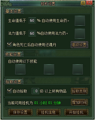 2)挂机界面包括如下内容:基本设置、技能设置、拾取设置、增加挂机时间等。