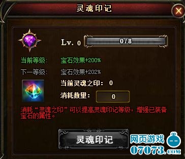 角色在职业进阶后开启系统“灵魂印记”,即在原有灵魂刻印基础上增加80级,可以使用道具“灵魂之印”培养,每级继续按照百分比提升宝石加成效果。