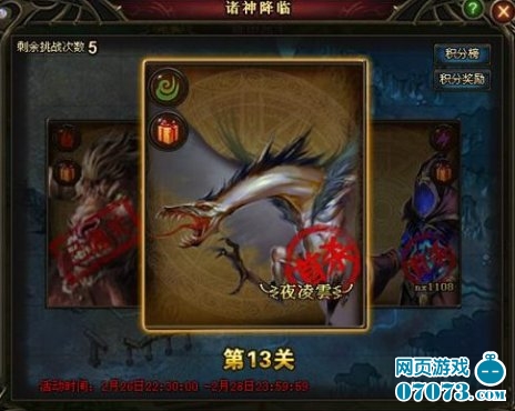 "诸神降临"为活动副本,单人PVE系统,活动期间,玩家可以通过点击活动图标开启界面进行挑战。每一关通关后,玩家将会获得一定数量的星之沙、黄金,而对于首个击杀BOSS的玩家将会获得额外奖励星之沙、星之泪碎片、积分,活动结束后更有丰富的积分排名奖励。