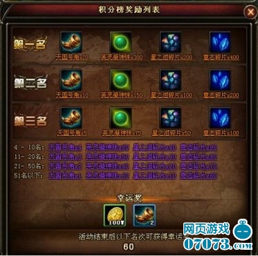 幸运奖:活动结束后结算第六十名将会获得幸运奖,百万黄金、天国号角。