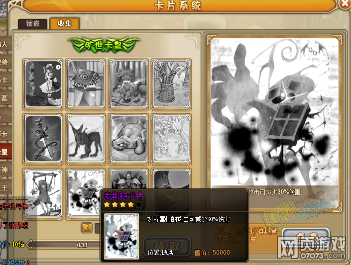 在游戏中刺客是在二转后又个毒性散发的技能,可以给玩家持续性的中毒效果。玩家如果在野外怕被刷挂被刺客击杀,可以在卡牌系统中插入一些对毒属性减少伤害的卡牌。比如麦斯特卡牌在披风位置可以对毒属性的攻击减少30%伤害。