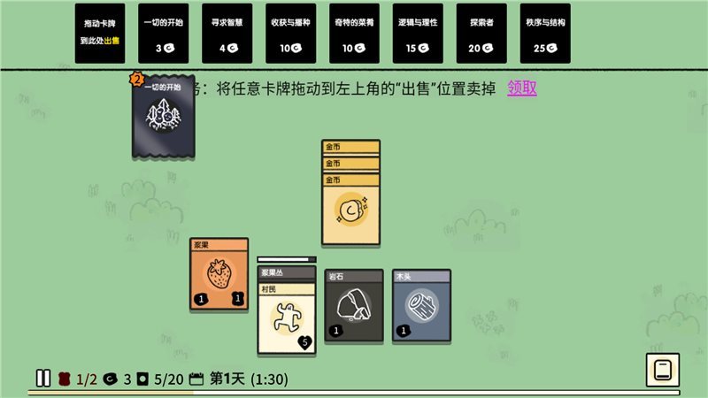 1.游戏中共114张卡牌,分为人与地点(12张),生物(12张),食物(16张),建筑(16张),资源(14张)几类,所有卡牌可以卖掉收获金币,而金币可以用来抽不同卡包:基础资源包(钥匙和泥土),灵感包(合成指南),探索包(地图区域,如森林、平原、古村)等