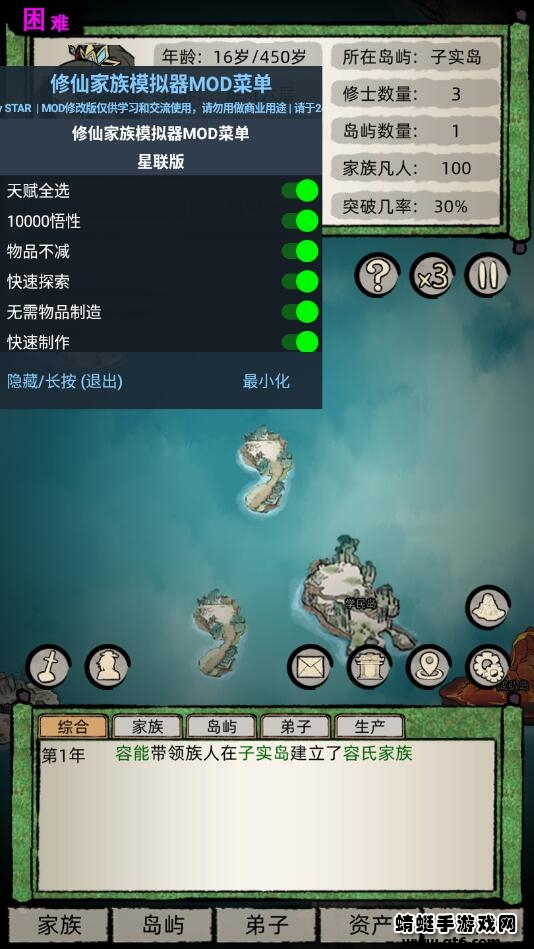 《修仙家族模拟器内置修改版》是一款非常好玩的模拟养成类游戏,你将作为一个家族的老祖,带领族人们来到一个修仙小岛让全族人一起修仙。不断探索海岛秘宝、发展家族,让家族所有人都可以飞升成仙。修仙家族模拟器内置修改版增加了修改菜单功能,可以选择无限灵石、快速探索、无条件制造、无限物品、免广告等等作弊功能。