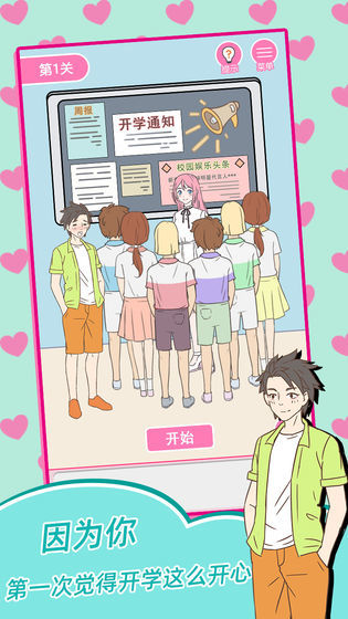 1、游戏采用简约的画面风格,趣味的恋爱模拟玩法;