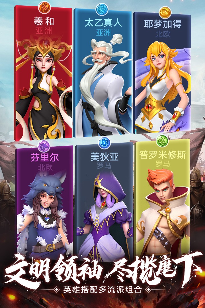 【皇座战争】中,最重要莫过于英雄池啦!根据背景故事,英雄们划分了北欧、罗马和亚洲三个阵营,同时也将英雄按照职业分为步兵、刀兵、枪兵、弓手和法师五种职业,其中步、刀、枪为相互克制的近战,而弓手和法师则为远程或辅助。