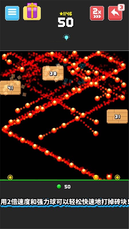 1、竖版玩法从最简单的关卡开始,弹球开始消除,将方块全部消除掉。