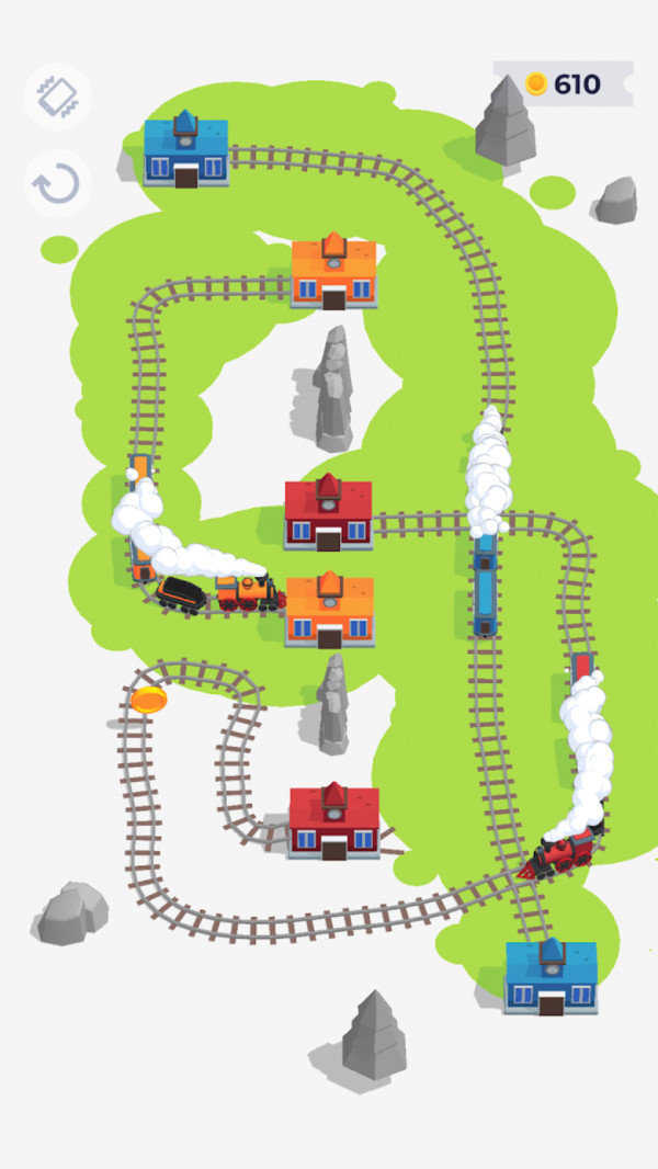 3、众多不同的关卡等待你的探索,你需要绘制出一个合理的火车线路图纸保障不会碰撞;