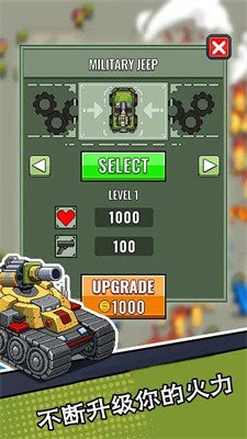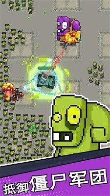 1.控制你的战车在场景内进行割草生存挑战,击败一定数量的僵尸可以对战车进行升级,获得随机的新能力。
