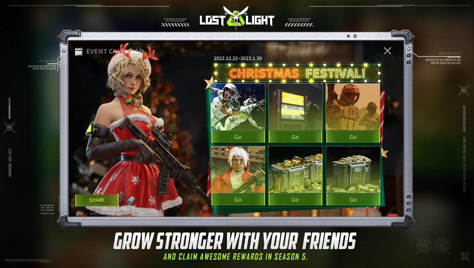 进入战场之前,在属于的你避难所做好万全的准备。合理使用、悉心维护升级避难所中每一个设备,保证良好的身体状态,提升身体机能,改装、搭配属于你的作战装备。要知道,战场外的一切才是你在战场中的最强保障。
