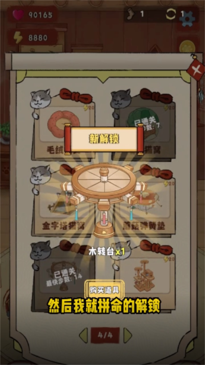 2、通过拼图解锁并且收集猫咪爱心值购买逗猫棒,猫抓板等等,也可以解锁新的房间哦!