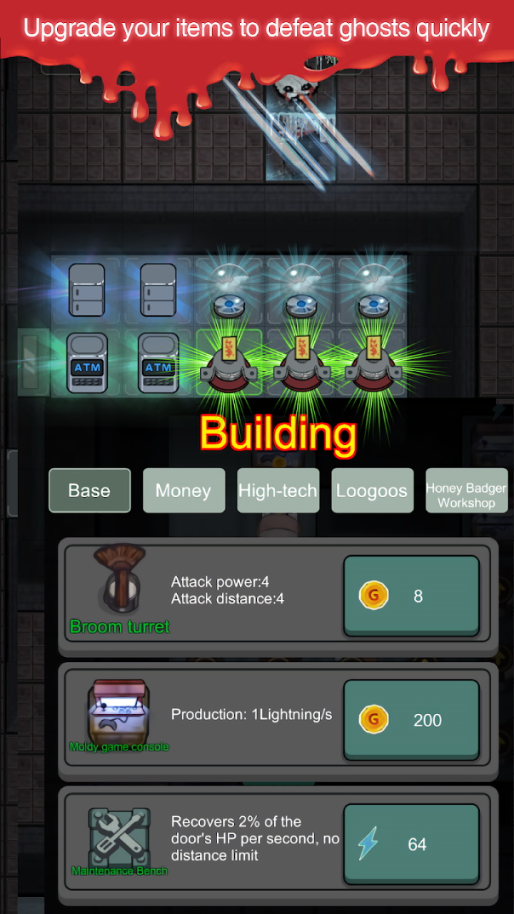 金币可以建造炮台和游戏机,也可以用来升级门、炮台和游戏机。