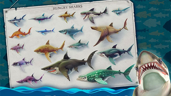 5、逐渐解锁更多水下凶猛野兽:灰鲭鲨、锤头鲨、虎鲨和无敌的大白鲨!