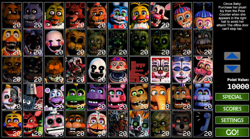1.欢迎来到终极的FNaF混搭游戏,在那里你将再次被单独困在办公室里,抵御杀手电子动画!在弗雷迪的游戏中,拥有跨越七个五夜的50个可选电子动画角色,定制选项几乎是无止境的。混合并匹配您喜欢的任何角色分类,将难度设置为0-20,然后立即投入行动!在办公桌上,您需要管理两个侧门、两个通风口以及两个空气软管,所有这些都直接通向您的办公室。