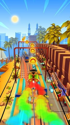 滑板,通过双击屏幕来启动滑板,滑板会持续一段时间。在没有滑板的情况下,角色撞到火车或者障碍等都会被抓住,游戏终结。但在有滑板的状态下,角色就有了一道保险,撞到火车等的时候,滑板会消失,游戏可以继续进行。