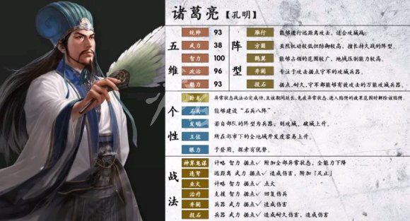 劣势:武力低,遇到高武伤害系战法吃亏,怕单挑。上面缺点是本作所有文官的共性,诸葛还好一点有马。