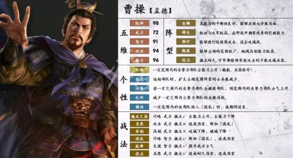 优势:高统高智,全剧本倚天剑有马,官职大部分剧本很高,拥有仅次于神算鬼谋的文官系战法,奸雄诗想不用说,屯田是一个容易被人忽视的强大特性,缺粮志14,连携多。