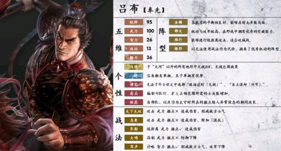 优势:高统满武,拥有最强群体战法天下无双(伤害系数15降敌方士气),飞将一骑不解释,全剧本方天戟,除184剧本有马。
