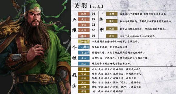 优势:高统高武,拥有略次于天下无双的群体战法军神(伤害系数15,升己方士气),全剧本青龙刀,官渡之后有马,最强团战增益光环军神(就是对自己无效被神机压一头),关家军团战无敌不解释。