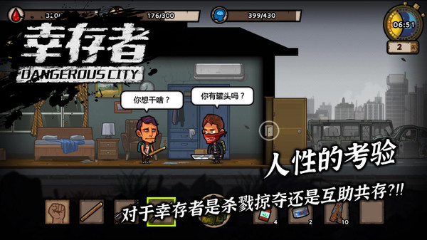 幸存者危城游戏操作十分简单,玩家点击屏幕即可控制角色移动,点击僵尸就能开启攻击模式。操作虽简单,但游戏的自由随机性和昼夜更替系统,都会给战斗带来不小的考验。要想在每次僵尸遭遇战中夺得战斗主导权,无脑刷刷刷一定是不行的。幸存者们还须仔细观察僵尸的移动速度和攻击频率,选用正确的武器将其一举拿下。游戏需要考虑策略对抗元素,这也颠覆了玩家原有的战斗体验,带来前所未有的末日战斗代入感!