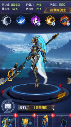 4.每个机甲战士都有不同的属性,选择自己钟意的战甲,方便你用心培养和改造。