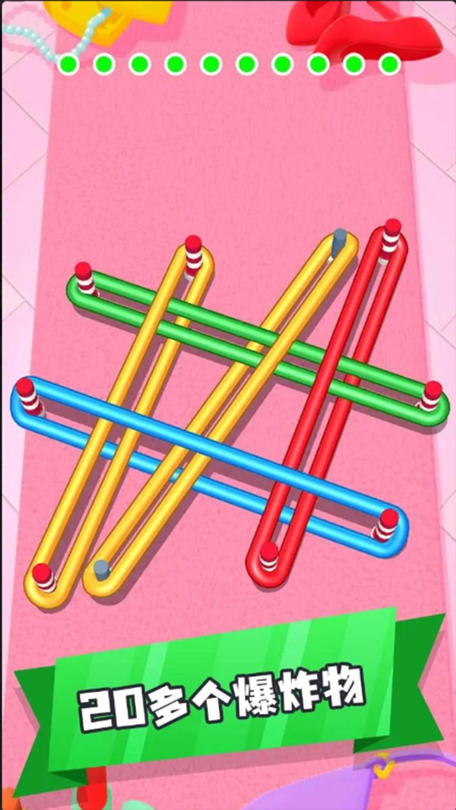 只需轻按别针即可松开橡皮筋并逐渐解开它们以完成每个关卡的挑战