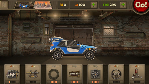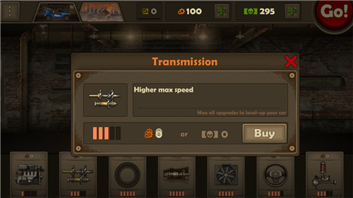 2、战车在车库进行升级,能够对战车的引擎、变速箱、推进器、轮胎等进行升级购买,每一部位都对战车的性能有着极大的提升,一部顶级的战车总是能够带领玩家冲向终点,所以,抓紧升级你的战车吧。