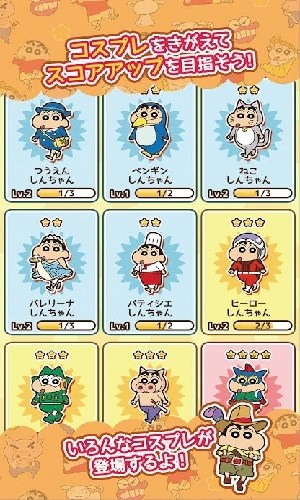 1、通关所获得的金币可以给小新买衣服和加成道具。