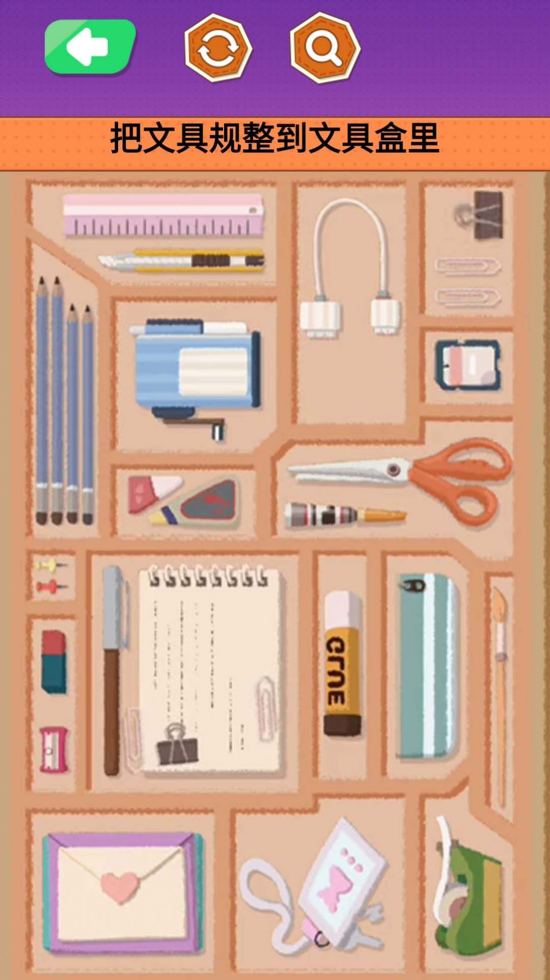 1、文具收纳大师是一款细节处理到位、难度适中的放松休闲游戏。