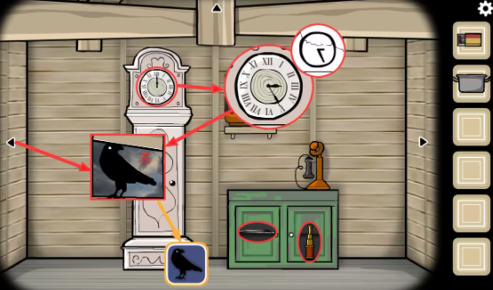 阁楼—落地钟视角:在柜子的左右两边分别获得(毛衣针)和(望远镜);点击落地钟,根据《案件23》打字机处获得的时间将落地钟的时间调整到3:25(点击内圈调整时针,点击带罗马数字的外圈调整时针,这回和《四季》里不一样,时针分针是按顺时针转的),点击左侧三角来到窗户视角,左侧窗户的哈维变成了一只乌鸦,点击乌鸦获得成就(老乌鸦),将乌鸦变回哈维只要将落地钟的时间调整为除3:25的其他时间就行。