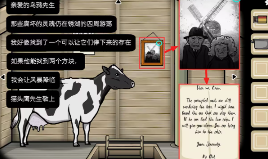 阁楼—奶牛视角:墙上挂着一幅乌鸦先生和老婆婆在磨坊前的合照,点击照片右上角的折角将照片撕下来,相框里藏着猫头鹰先生给乌鸦先生的另一封信,内容如图。