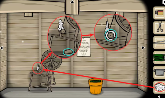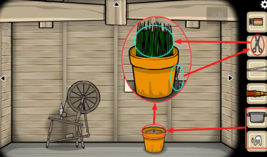 阁楼—纺织机视角:将(鸟屎)和(盛有水的锅)里的水倒入盆栽中,退出盆栽的放大界面后盆栽里的草都长了出来;点击获得盆栽右后方的(剪刀),用(剪刀)将长出来的(草)剪下来。