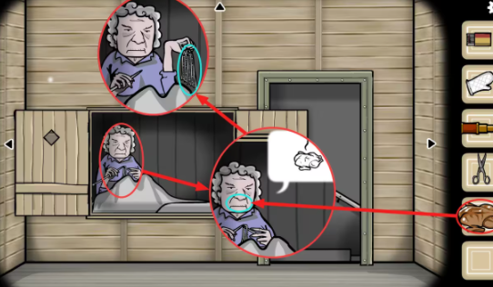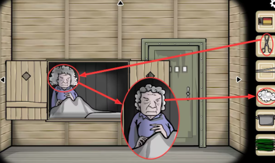 客厅—大门视角:用(剪刀)剪掉老婆婆的(头发)。