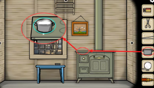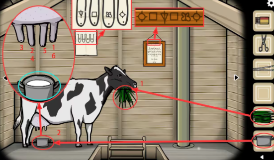 阁楼—奶牛视角:将(草)塞到奶牛的嘴里,点击几次让它吃下去(不然挤不出奶);将(锅)放到奶牛的肚子底下,根据墙上的纸头我们可以得知奶牛的每个奶头代表的符号,根据相框上的符号我们可以得知按照对应符号挤奶的顺序,按图中的顺序点击奶头,牛奶挤满了整个锅,获得(有牛奶的锅)(牛奶是将正确的顺序按完后一次性挤出来的)。