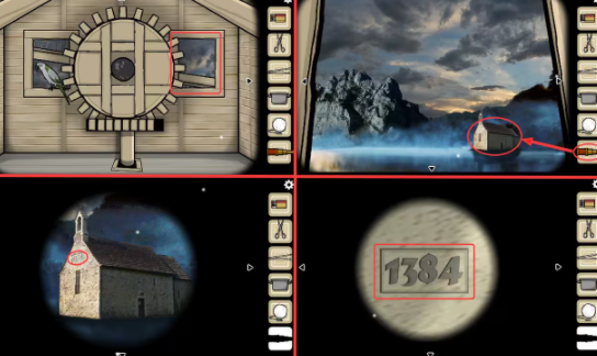 阁楼—窗户视角:点击右侧窗户,窗外有个小教堂,选中(望远镜)放大视角,可以看到窗户上方有一串数字“1384”。